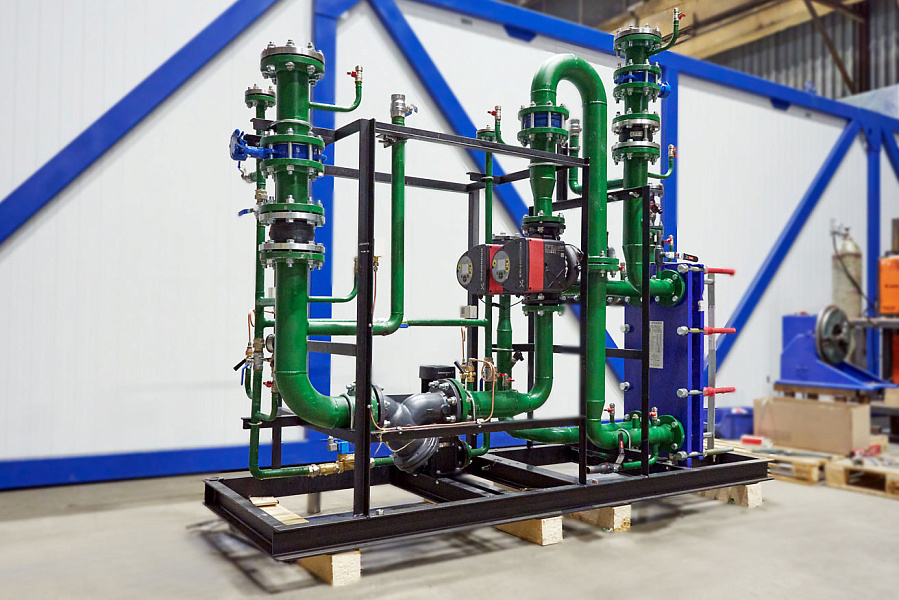 Конструкция включает несколько функциональных компонентов — запорно-регулирующая арматура, теплообменное оборудование, циркуляционные насосы и трубопроводная обвязка. Все элементы смонтированы на общей платформе. Это упрощает монтаж и обслуживание модуля.