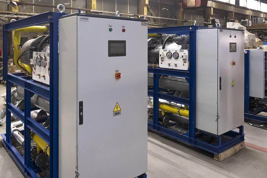 Чиллеры собраны на базе винтовых и спиральных компрессоров FuSheg (Тайвань). На раму каждого чиллера интегрирован шкаф управления с устройством плавного пуска. Холодильные машины на площадку поставляются в полной заводской готовности и заправлены необходимым количеством хладагента.
