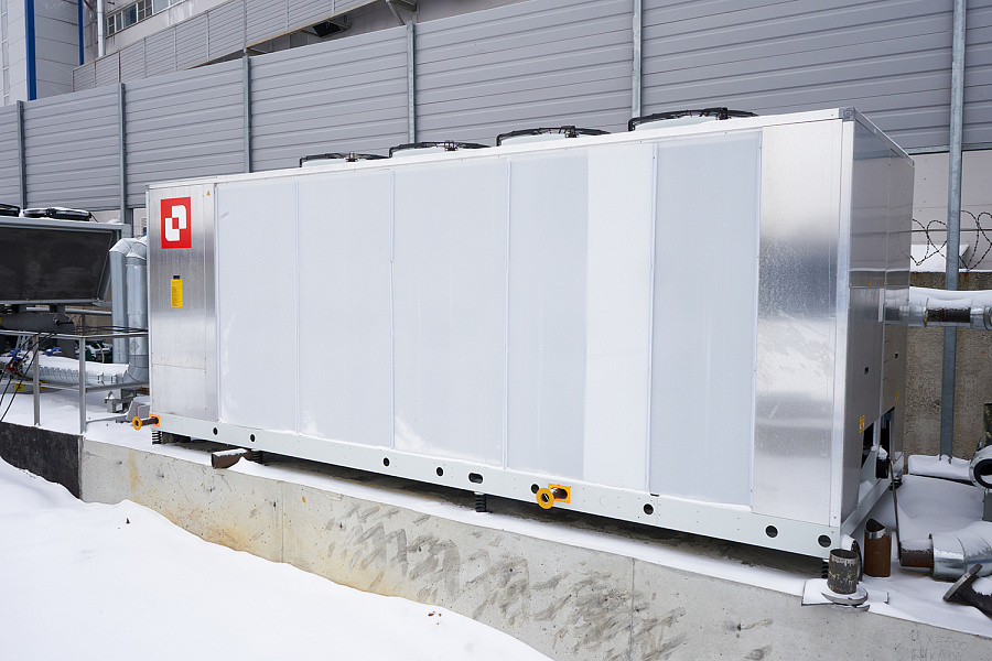 Холодильная машина NECS-FC-Y/B 1404 со встроенным контуром естественного охлаждения, производительность Qo=377 кВт, габариты (ДхШхВ): 6,11х 2,20 х 2,48 м, масса = 3810 кг. Производитель «Climaveneta» Италия.