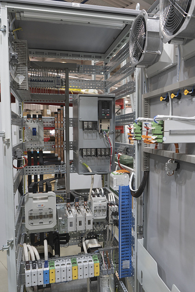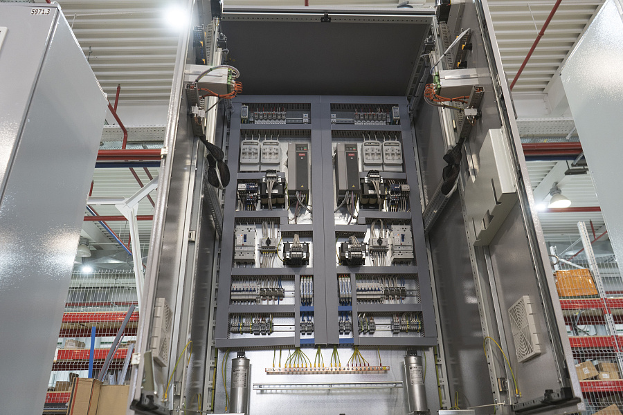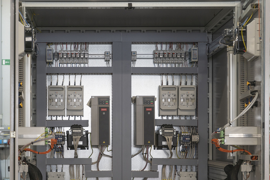 Шкафы управления для насосных установок по ТУ3667-020-00137182. Управление насосами осуществляют частотные преобразователи, предусмотрен байпас работы от сети. В составе шкафов установлены конденсаторные устройства для компенсации реактивной мощности. Добавлены сетевые и моторные дроссели. Комплектующие преимущественно отечественного производства (КЭАЗ, ДКС, EKF, СЗСЭМ, Элемер).